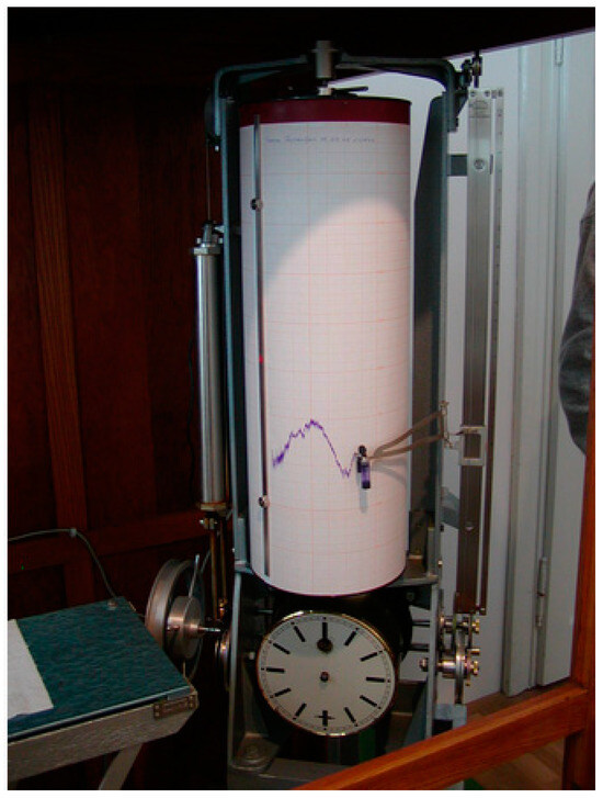 For a better understanding of the procedure of mean sea level determination, a short description of a conventional tide gauge is necessary. The tide gauge (Figure A1) consists of a float, which rises and falls together with the surface of the sea in a well. The inside of the well is connected to the sea by a pipe. The raising and lowering of the float are transmitted by means of the connecting wire to the transmission mechanism, which raises and lowers the pen stick. On the registration roller, which rotates using a clock mechanism, a chart paper is placed, on which the pen records the curve of sea level fluctuations, i.e., the tideogram. The connecting wire, on the other hand, is loaded with a weight, which keeps the connecting wire taut, and it is therefore referred to as a ‘counterweight’. Its weight is measured according to the weight of the float so that when raising and lowering the float, the connecting wire is constantly taut. The tide gauge effectively protects the float from the wind, the waves, and the drift [14]. A more detailed description of the tide–well system for the suppression of short-term sea surface oscillations is provided in [2,93], respectively.