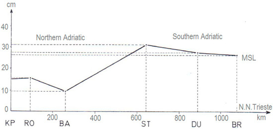 Relation of the Adriatic mean sea levels (MSLs) along of the Eastern Adriatic coast for Koper (KP), Rovinj (RO), Bakar (BA), Split (ST), Dubrovnik (DU), and Bar (BR) for the period 1954–1977 and N.N. for Trieste for the year 1875 (Adapted with permission from [16]).