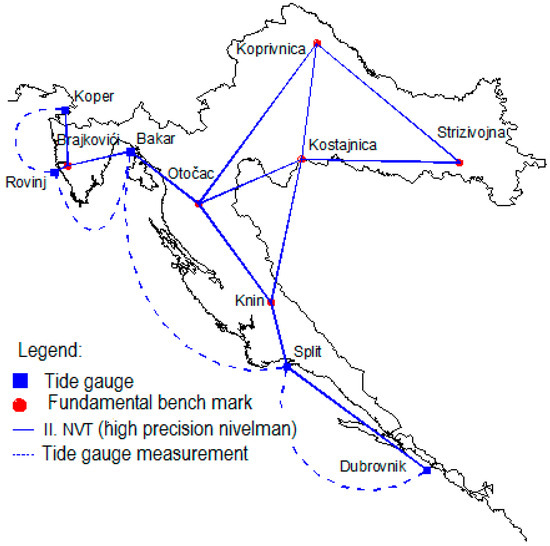 Since the Republic of Croatia became independent after the beginning of the 1990s, significant work has been devoted to the improvement of the existing fundamental height networks inherited from the former Yugoslavia but mostly initiated by the State Geodetic Administration and the Faculty of Geodesy of the University of Zagreb [4]. The origin for the new reference height system of Croatia has been determined by the mean sea levels at five tide gauges along the eastern coast of the Adriatic Sea. Years of mechanical tide gauge installation are cited in brackets after their names, and they have still been operating in a modernized form since the year 2005 [69]: Kopar (1962), Rovinj (1955), Bakar (1930–1938, 1954), Split (1954), and Dubrovnik (1954). The absolute heights of the TG referent benchmarks are 1.8826 m, 4.8377 m, 2.6601 m, 3.3322 m, and 3.6771 m, respectively. Apart from these tide gauges, six fundamental benchmarks, with a very high quality of the underground stabilization, have also been integrated in the height system: Brajkovići, Kostajnica, Knin, Koprivnica, Otočac, and Strizivojna (Figure 6). All the tide gauges which, by highly accurate levelling, are connected with a skeleton of the height system have been continuously observing the sea level for 18.6 years, and the mean sea levels have been determined for the period from the year 1962.2 to the year 1980.8, centered on 1st July 1971, i.e., on the year 1971.5. Computationally determined mean sea levels were transferred to reference benchmarks next to each tide gauge, i.e., the absolute heights of these benchmarks were determined by these mean sea levels.