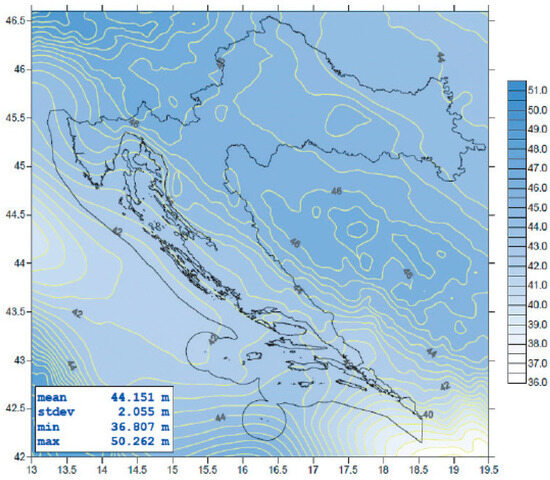 HRG2009 (HR—international abbreviation of Croatia; G—Geoid; year 2009) geoid solutions for Croatia of ‘very high reliability’ [18,19] are reprinted in Figure 7. According to these results, most geoid surface isohypses are approximately parallel to the Eastern Adriatic coast and thus the mean sea levels are approximately constant for the closest TGs at least. An exception is the southern part of the area where geoid surface isohypse pattern is more complex.