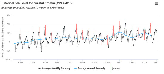 The average monthly and annual anomalies (mm), respectively, referred to as the multiannual averages for the period 1993–2012 for the coastal area of Croatia made by the satellite altimetry. Available at the World Bank web page: https://climateknowledgeportal.worldbank.org/country/croatia/impacts-sea-level-rise (accessed on 31 December 2022).