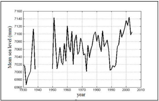 The mean sea levels (MSLs), in millimeters, for the tide gauge in Bakar for the period between 1930 and 2005. Missing data are indicated by blank (after [21]).