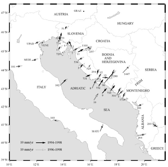 Thus, a comparison of horizontal velocities between these two solutions (1996–1998 and 1994–1998) by Altmer et al. [77] indicates that the motion of the Bakar station, number 2 in Figure 12, exhibits a different magnitude (velocity) and direction for each solution. The authors of [77] assumed that the motion for this station is local due to unstable pillar. However, at the 0.95 confidence level, the vertical velocities for most of the stations are not significant, and hence, they were not discussed in [77].