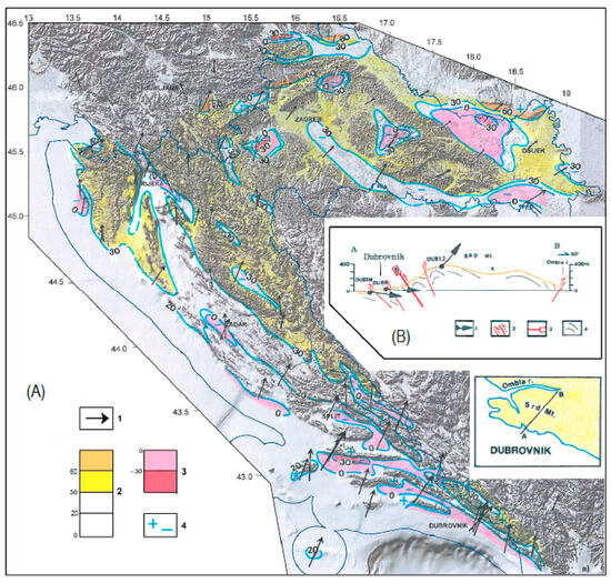 (A) Slope angles and directions of annual velocities of geodetic points (for the period 2008–2013). Legend: 1—directions of annual velocity at geodetic points in mm/year; 2—spatially positive motions (uplift) greater than 0°, 20°, 30°, and 60°; 3—spatially negative motions (descending) greater than 0°, −30°; 4—maximum and minimum slope angles. (B) Slope angle and directions of annual velocities for Dubrovnik area (for more details, please see [75]).