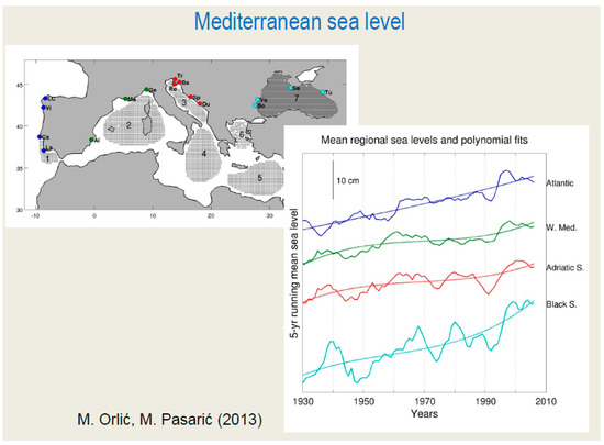 Following their previous research, Orlić and M. Pasarić obtained valuable results, published in [35], which are partly presented in Figure 15. They concluded that there are some indications that over the last twenty years or so, the rate of the sea level rise considerably increased in the Black Sea and thus surpassed the rate in the Atlantic, while in the West Mediterranean and in the Adriatic, it became similar to the rate in the Atlantic.
