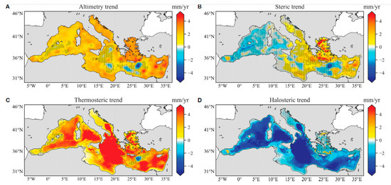 Trend of total sea level (A), steric (B), thermosteric (C), and halosteric (D) components, calculated over satellite altimetry era (1993–2019). Black dots mark areas in which the trend is non-significant (95% CI). (Adapted with permission from Ref. [85]).