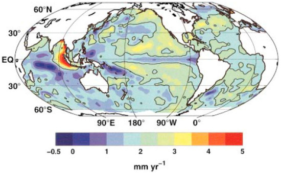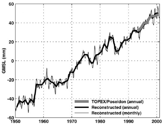 - Chambers, D.P.; Mehlhaff, C.A.; Urban, T.J.; Fujii, D. Low-frequency variations in global mean sea level. J. Geophys. Res. 2002, 107, 3026. [Google Scholar] [CrossRef]
