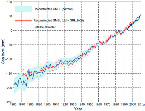 - Church, J.A.; White, N.J. A 20th century acceleration in global sea level rise. Geophys. Res. Lett. 2006, 33, 1–4. [Google Scholar] [CrossRef]