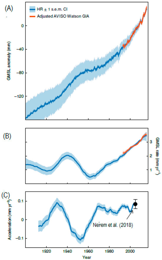 - Watson, C.S.; White, N.J.; Church, J.A.; King, M.A.; Burgette, R.J.; Legresy, B. Unabated global meansea-level rise over the satellite altimeter era. Nat. Clim. Chang. 2015, 5, 565–568. Available online: https://www.nature.com/articles/nclimate2635 (accessed on 15 November 2023). [CrossRef]