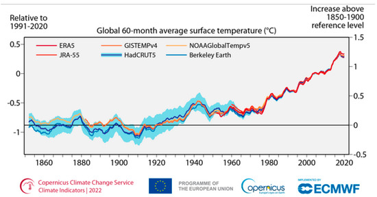 - IPCC. 2021: Summary for Policymakers. In Climate Change 2021: The Physical Science Basis. Contribution of Working Group I to the Sixth Assessment Report of the Intergovernmental Panel on Climate Change; Masson-Delmotte, V.P., Zhai, A., Pirani, S.L., Connors, C., Pean, S., Berger, N., Caud, Y., Chen, L., Goldfarb, M.I., Gomis, M., et al., Eds.; Cambridge University Press: Cambridge, UK, 2021. [Google Scholar]