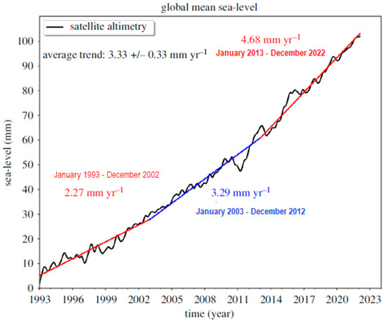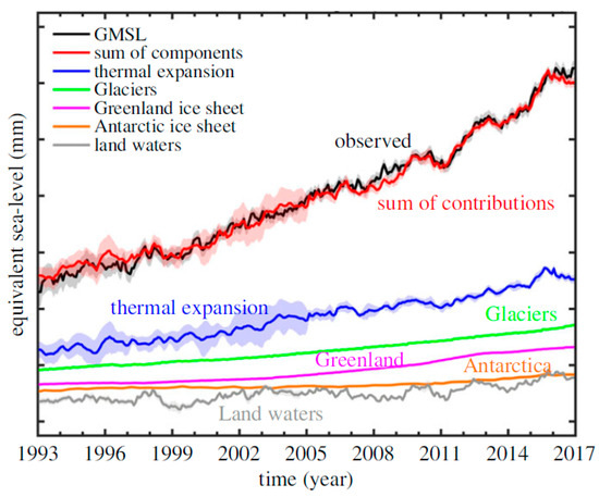 - Chen, X.; Zhang, X.; Church, J.A.; Watson, C.S.; King, M.A.; Monselesan, D.; Legresy, B.; Harig, C. The increasing rate of global mean se level rise during 1993–2014. Nat. Clim. Chang. 2017, 7, 492–495. Available online: https://polarice.geo.arizona.edu/papers/Chen.etal.AcceleratingGMSL.NClimate.2017.pdf (accessed on 15 November 2023). [CrossRef]