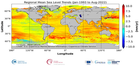 - Cazenave, A.; Gouzenes, Y.; Birol, F.; Leger, F.; Passaro, M.; Calafat, F.M.; Shaw, A.; Nino, F.; Legeais, J.F.; Oelsmann, J.; et al. Sea level along the world’s coastlines can be measured by a network of virtual altimetry stations. Commun. Earth Environ. 2022, 3, 177. Available online: https://www.nature.com/articles/s43247-022-00448-z (accessed on 15 November 2023). [CrossRef]