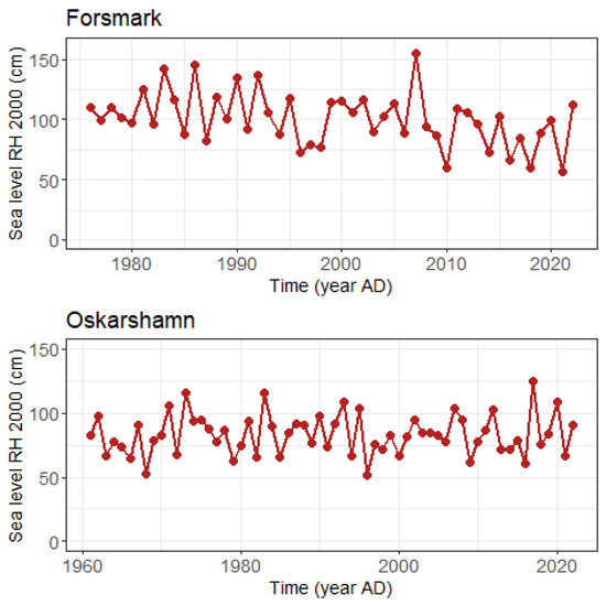 Data in this study are hourly measurements of sea level (in cm) from recordings provided by the Swedish Meteorological and Hydrological Institute (SMHI). The sea levels are presented in relation to the zero level in the National Height System called RH2000. For the sake of simplicity, the RH2000 values were kept in the statistical analyses—the main objective is to compare statistical estimation techniques. However, the observations can be corrected for relative sea-level change (i.e., isostasy and eustasy). In the document [15] from SMHI, formulae are provided for such corrections. See [16], Section 2.3, for an example.
