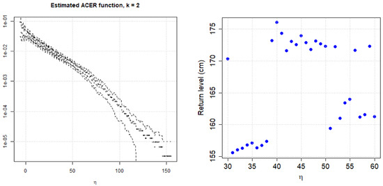 Illustrations for Forsmark. Left panel: Plot of the estimated ACER function (for ) for assessing a proper value of the tail marker . Right panel: Stability of return-level estimates. Choice by the author: .