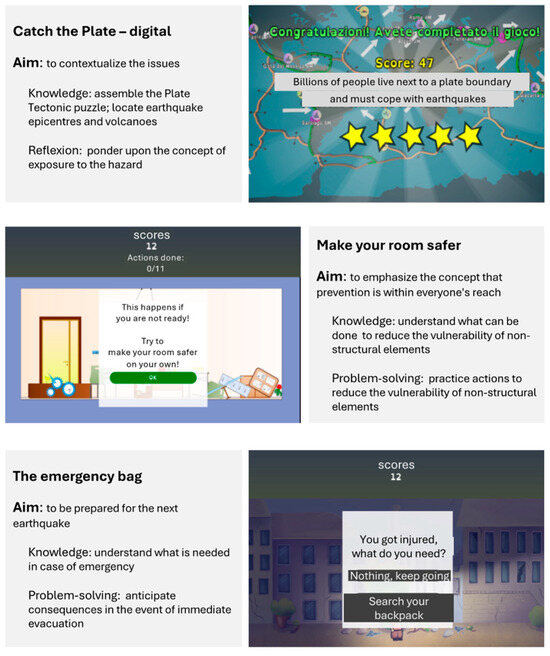 The same three games were subsequently featured in science outreach events, such as ScienzAperta (“Open Science”) in April 2023 (https://ingvterremoti.com/2023/05/31/scienzaperta-scuole-2023-presso-la-sezione-di-milano-dellingv/; accessed on 2 April 2024) and the Week of Planet Earth in October 2023 (https://www.mi.ingv.it/index.php/it/didattica-e-divulgazione/news/114-la-settimana-del-pianeta-terra-presso-la-sezione-ingv-di-milano; accessed on 2 April 2024), at the National Institute of Geophysics and Volcanology, and in schools in the frame of the educational activities that the authors usually carry out. They were used in single-player mode with a common discussion at the end of the gaming section. These additional experiences are not addressed in this paper.