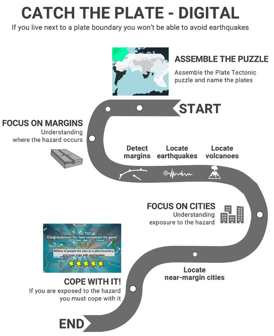 The game draws inspiration from the activity “The Plate Tectonic Puzzle” [29,30], where children collaborate in teams to position small tokens representing volcanoes and earthquake epicentres on a previously assembled wooden jigsaw puzzle of tectonic plate pieces. The activity was later adapted into a carboard game called “Catch the Plate” [30] where the assembly of the jigsaw puzzle is followed by quizzes related to specific earthquakes and volcanoes, engaging players in small teams. Both the activity and the cardboard game primarily offer phenomenon-oriented information. By addressing exposure, Catch the Plate—Digital transforms the game into a more suitable tool for seismic DRM purposes.