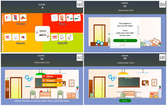 Screenshots of Make Your Room Safer serious game in the single-player mode. Cards showing building content are categorized based on measures to reduce the content vulnerability (a); earthquake damage to non-structural elements before any preventive action is taken (b); selection of the measures to reduce the vulnerability of the non-structural components (c); and effectiveness of the implemented measures (d). The text in English shown in the figure is edited and superimposed on the French/Italian text.