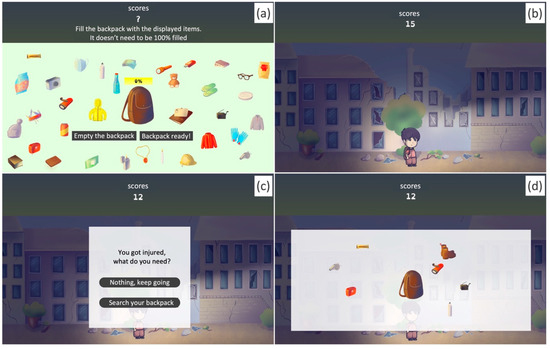 Screenshots of The Emergency Bag serious game in the single-player mode showing the tools that can be chosen to fill the backpack (a). Each tool is accompanied by a percentage indicating the volume it occupies in the bag as well as the available space remaining. A child is depicted facing typical post-disaster situations where key items are needed. The child walking at night in the postdisaster’s environment (b); an injured post-disaster situation (c); selection of the tool from those available in the bag to address a post-disaster situation (d). The text in English shown in the figure is edited and superimposed on the French/Italian text.