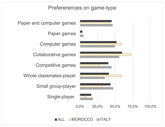 Students’ answers on whether they like group games and computer, paper, collaborative, or competitive games. The breakdown of percentages (Morocco, Italy, and whole sample) is shown.