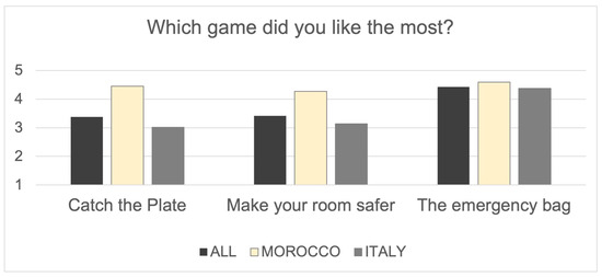 Students’ answers to the question “Which game did you like the most?” The Y axis plots the average preference of the students in a 5-level Likert scale [34], with 1 matching less and 5 matching a lot. The breakdown of preferences (Morocco, Italy, and whole sample) is shown. The title displays the question asked to the students.