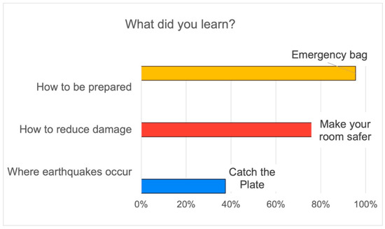 To evaluate students’ comprehension of the primary messages conveyed by the serious games, we addressed students with the following open-ended question: “What did you learn?” The answers were grouped into three categories intended to be related to the game messages, preparedness, prevention, and earthquake occurrence, delineated by the phrases “how to be prepared,” “how to reduce damage,” and “where the earthquakes occur.” Subsequently, we charted the occurrence of the answers falling in the relevant category for each game (Figure 10). The illustration indicates that, overall, students understood the intended message for each game. However, notably, The Emergency Bag game demonstrated the highest effectiveness, with 95% of correct responses.