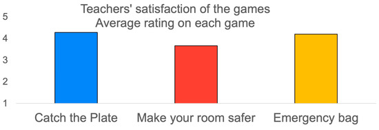 To assess teachers’ overall satisfaction, we calculated the average scores for each game across the six attributes. The analysis revealed that teachers’ perspectives were generally aligned with those of the students (compare Figure 9 and Figure 12). However, teachers showed a greater preference for Catch the Plate.
