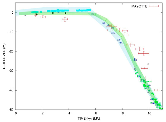 - Bard, E.; Hamelin, B.; Delanghe-Sabatier, D. Deglacial Meltwater Pulse 1B and Younger Dryas Sea Levels Revisited with Boreholes at Tahiti. Science 2010, 327, 1235–1237. [Google Scholar] [CrossRef] [PubMed]