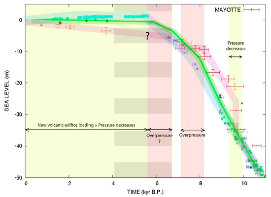 - Zinke, J.; Reijmer, J.J.; Thomassin, B.A.; Dullo, W.C.; Grootes, P.M.; Erlenkeuser, H. Postglacial flooding history of Mayotte lagoon (Comoro Archipelago, southwest Indian Ocean). Mar. Geol. 2003, 194, 181–196. [Google Scholar] [CrossRef]