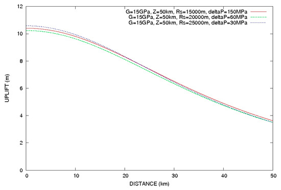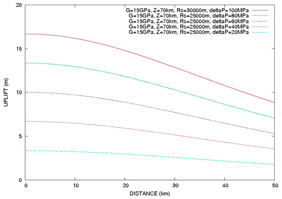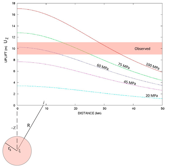 - McTigue, D.F. Elastic stress and deformation near a finite spherical magma body: Resolution of the point source paradox. J. Geophys. Res. 1987, 92, 12931. [Google Scholar] [CrossRef]