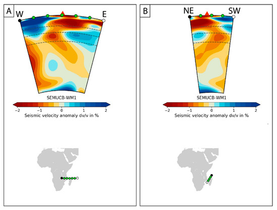 - Barruol, G.; Sigloch, K.; Scholz, J.R.; Mazzullo, A.; Stutzmann, E.; Montagner, J.P.; Kiselev, S.; Fontaine, F.R.; Michon, L.; Dyment, C.; et al. Large-scale flow of Indian Ocean asthenosphere driven by Réunion plume. Nat. Geosci. 2019, 12, 1043–1049. [Google Scholar] [CrossRef]