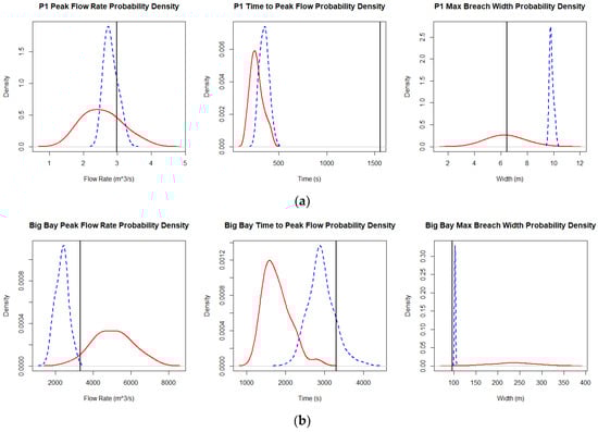 (a) HERU P1 and (b) Big Bay probability density plots. The red solid line is DLBreach and the blue dotted line is WinDAM C.