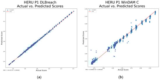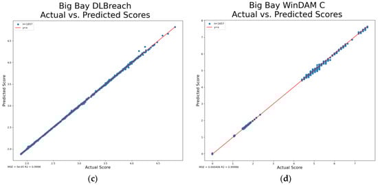 Regression model Perf1 scores vs predicted Perf1 scores for (a) HERU P1 DLBreach (MSE = 0.000019, R2 = 0.99946), (b) HERU P1 WinDAM C (MSE = 0.0008, R2 = 0.99558), (c) Big Bay DLBreach (MSE = 0.00005, R2 = 0.9998), and (d) Big Bay WinDAM C. (MSE = 0.0004, R2 = 0.99986).