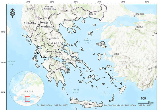 Greece (Figure 1) is home to a population of 10,482,487 individuals as per the Population Census of 2021 conducted by the Hellenic Statistical Authority, and it covers an expanse of 131,957 square kilometers and boasts a coastline that stretches over 13,676 km [92]. The country experiences a diverse climate, ranging from hot and arid summers to cold and rainy winters. This climatic variety, intertwined with Greece’s mountainous terrain and the widespread distribution of its numerous islands, gives rise to a diverse array of microclimates, ecosystems, and landscapes [93,94,95,96]. This intricate environmental tapestry not only contributes to the country’s natural beauty but also forms the backdrop for a flourishing tourism sector, particularly during the summer season, serving as a pivotal driver for the Greek economy [92,97,98].