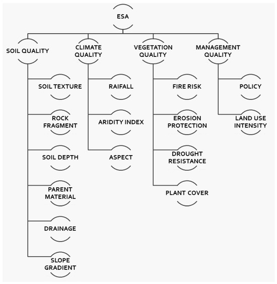 To calculate the ESAI, data related to soil characteristics, climate patterns, vegetation cover and land management practices are necessary, as shown in Figure 2. This integrated approach aims to provide a comprehensive assessment and categorization of vulnerability, providing a strong basis for informed environmental management and policy decisions.