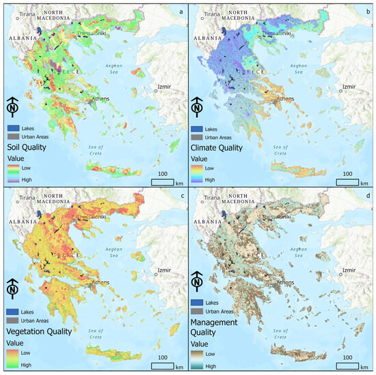 Maps of the Sub-Indices of ESAI, (a) Soil Quality Index, (b) Climate Quality Index, (c) Vegetation Quality Index and (d) Management Quality Index.