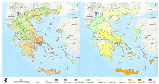 The beginning of this research focused on Greece’s vulnerability to desertification in the period from 1984 to 2004. These provided the impetus for further investigation and analysis of the findings. Initially, the necessary data for the calculation of the Environmentally Sensitive Areas Index (ESAI) were collected. This index demonstrates the vulnerability of an area to desertification using some parameters such as soil characteristics, geology, vegetation cover, climate patterns and anthropogenic activities. Each of these parameters is subjected to a specific categorization with regard to their weighting. Four main quality dimensions are used to calculate the composite indicator (soil, climate, vegetation and applied land management practices). Fifteen sub-indices are generated from these indicators, from which the ESAI is finally calculated. This index is stratified into eight distinct categories (Table 1) and grouped into four types using the geometric mean [42].