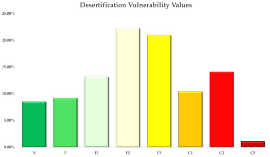 Utilizing the quartet of indicators encompassing (Climate, Soil, Vegetation, and Management), relational Equation (4) was systematically employed. The cumulative results derived from this application facilitated the comprehensive assessment of Environmentally Sensitive Areas, specifically those susceptible to desertification. This evaluative process extended into the spatial realm, with the utilization of a Geographic Information System (GIS) environment to generate a corresponding map. Subsequently, the outcomes were meticulously compiled into Table 1, offering a structured presentation of the categorized areas based on their sensitivity to desertification. The categorization unveiled in Table 1 delineates eight distinct classes: Areas deemed non-sensitive to desertification, those classified as potentially sensitive, and a spectrum of sensitivity levels (F1, F2, and F3). Furthermore, the categorization extends to encompass critical areas (C1, C2, and C3), with a particular emphasis on Class C3, where the potential for restoration remains plausible (Figure 5). This nuanced classification scheme not only provides a granular understanding of the diverse environmental sensitivities but also lays the groundwork for targeted interventions and informed environmental management strategies. The amalgamation of relational equations, GIS technology, and systematic categorization enhances our ability to discern and address the intricacies associated with environmentally sensitive areas, fostering a holistic approach towards sustainable land management practices.