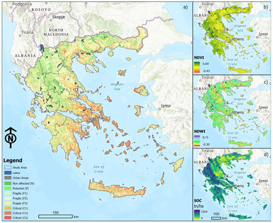 In order to validate the ESAI, three separate indices were used, namely the Normalized Difference Vegetation Index (NDVI), the Normalized Difference Water Index (NDWI) and the Soil Organic Carbon (SOC). The maps for the NDVI and the NDWI were derived from Landsat 5 (https://developers.google.com/earth-engine/datasets/catalog/landsat-5, accessed on 20 April 2024) for the period 1984–2004 and the map for the SOC was derived from the Soil Grids (https://soilgrids.org/, accessed on 20 April 2024).