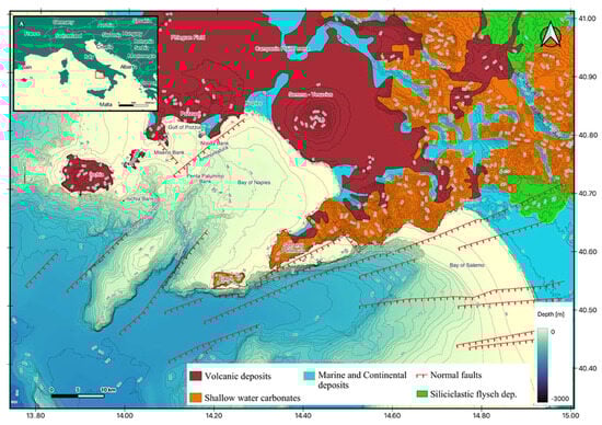The Bay of Naples represents a half-graben on the continental margin, produced by broad extension alongside the Apenninic chain [] (Figure 1). The geological framework of this basin is characterized by alternating structural highs and lows in a transtensional tectonic setting [,,]. In the Campania country, Quaternary basin deposits overlie the westerly Apenninic tectono-stratigraphic sequences, arising from the continuation toward the offshore of the matching units outcropping in the marginal zone of the southern Apennines [,]. These tectonic assemblages compose the basement of the littoral basins and consist of flysch deposits or of Meso–Cenozoic carbonates (Figure 1).