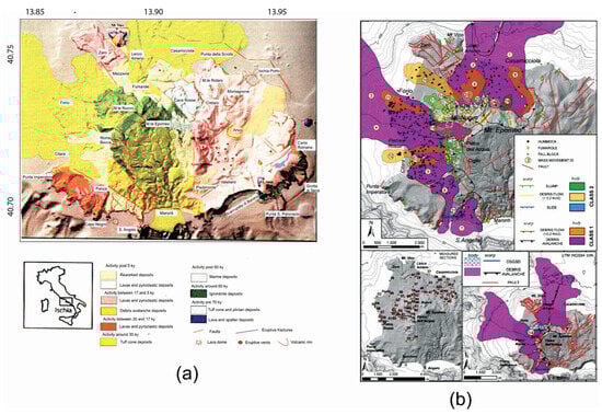Ischia Island has been deeply studied regarding the debris avalanche deposits, both offshore [,,,,] and onshore (Figure 3a []). Seven debris avalanches surround the Epomeo Mt., showing a close relationship with the corresponding deposits on the continental shelf [] (Figure 3b).