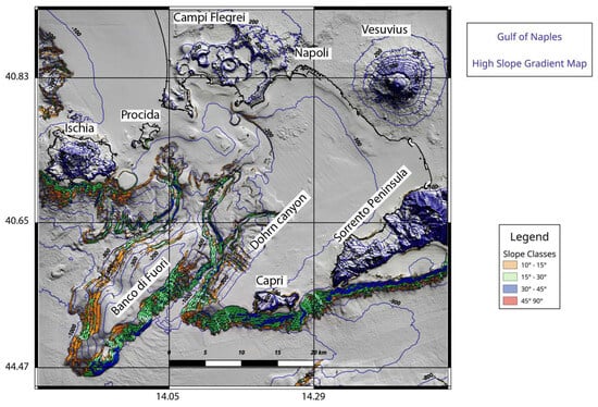 Significant submarine slides occur in the Dohrn canyon system, where slide scars do not correspond with adjacent slide deposits, which have probably been reworked and removed by sea bottom currents [,,]. During the late Quaternary, submarine slides mainly involved both the canyon’s heads, being double regressive (Dohrn) and triple regressive (Magnaghi). In this area, the geological evolution of submarine slides has been explained according to the three-stage model of Pratson and Coakley [] for submarine canyon evolution []. This approach is centered on the modification of the slope failures in a canyon with a retreating head, receding upward on the slope along the pre-canyon channels, as dictated by the retrogressive slides modulated by strong volcaniclastic input. The first phase, corresponding to the carving of the pre-canyon channels, happened in a time interval ranging between 37 ky B.P. (eruption of the Campanian Ignimbrite) and 15 ky B.P. (eruption of the Neapolitan Yellow Tuff). The second phase, corresponding to the canyon development through slope failures, happened later than 15 ky B.P. (eruption of the Neapolitan Yellow Tuff) []. The third stage, corresponding to the individuation of the canyon retrogressive heads, is older than the growth of the Nisida volcanic bank (Naples offshore), physically interrupting the Dohrn western branch (4.8–3.8 ky B.P.) []. Figure 4 shows the high-slope map of Naples Bay, which was previously constructed [], identifying the areas prone to slide, which are those having gradients greater than 10°.