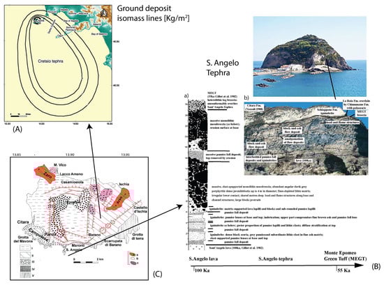 (A) Ground deposit isomass lines (kg/m2) on domain covered by Cretaio tephra (Tyrrhenian Sea; modified after Primerano et al. []. (B) S. Angelo tephra of Ischia (modified after Brown et al. []) (a) Sketch stratigraphic column of the tephra. (b) Significant outcrop of the S. Angelo tephra. (C) Location of the Cretaio and S. Angelo tephra superimposed on the geological map of Ischia. Key. I scree and mud flows; II volcanic units younger than 10,000 years; III older volcanic rocks (between 20,000 and 33,000 years ago); IV GreenTuff of Mount Epomeo; V first volcanic complex, now dismantled (including the firstand the second phase of Ischia activity).