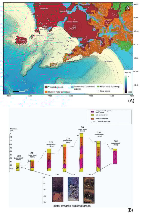(A) Location map of the cores showing marine tephra in Naples Bay (modified after Aiello and Caccavale []. (B) Sketch stratigraphic section of the C69, C71, C73, C70, C4, C82, and C81 cores [,,], in which the top of the tephra layer has been reported, and detailed core photographs showing the passage from distal (fine-grained) to proximal (coarse-grained) areas.