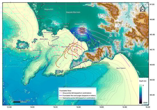 Milia et al. [] explained the effects of the pyroclastic fluxes in Naples Bay. In particular, these authors constructed a map showing the main pyroclastic fluxes entering the sea in Naples Bay (Figure 7). These fluxes have been represented by the isopachs of the AD 79 pumice fall deposits and pyroclastic flow deposits (Figure 7). An undersea volcaniclastic fan that has its roots in the AD 79 eruption of Vesuvius stands for the resiliency of the PDCs that fossilized the Roman village of Herculaneum (Pompei). This fan represents a well-documented stratigraphic record of PDCs that erupted on the continental platform in a shallow water setting, as controlled by syn-depositional reworking through wave action.