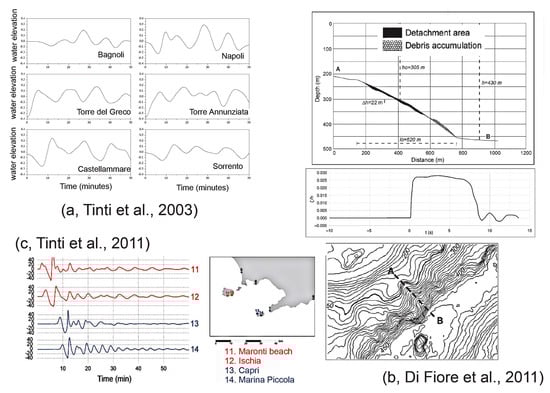 Mareograms related to tsunami in Naples Bay ((a), modified after Tinti et al. []), ((b), modified after Di Fiore et al. []), and Ischia ((c), modified after Tinti et al. []). In sub-figure (b), h0 is the characteristic water depth, h is the water depth, and ζ is the free surface displacement. In sub-figure. AB is the bathymetric profile. (c), the modeled tsunami refers to Ischia as controlled by the Ischia debris avalanche (IDA) [].