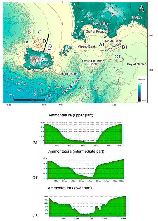The detailed digital terrain model (DTM) and bathymetric profiles are herein revised (Figure 9). The center of the Bay of Naples is outlined by the Ammontatura channel, which is the seabed physiographic expression of the Ammontatura slope basin. The channel is 2.5 km wide and 20–40 m deep. The DTM and bathymetric profiles have displayed that this channel shows a curved form, a smooth thalweg, and unbalanced scarps. This channel splits the “Banco della Montagna” feature from the volcanic brinks of Campi Flegrei. Bathymetric profiles demonstrate that the western slope of the Ammontatura channel is broadly more precipitous than the eastern one. In its northernmost part, the pivot of the channel flexes toward the northwest and shortly aborts N of the Nisida Bank (Figure 9).