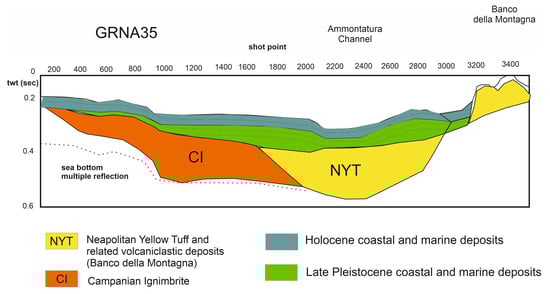 The seismic profile GRNA35 has shown the stratigraphic architecture of the Naples Bay continental shelf (Ammontatura Channel; Figure 10); un-interpreted and interpreted seismic sections have been provided (Figure 10 and Figure 11). The geological interpretation of the GRNA35 seismic profile showed that the Ammontatura slope basin contains two important volcanic seismic units, i.e., the Campanian Ignimbrite (CI) and the Neapolitan Yellow Tuff (NYT; Figure 11). In the two coastal and marine seismic units, which are late Pleistocene and Holocene in age, volcaniclastic sedimentation is significant. The CI deposited during isotopic stage 3, while the NYT deposited during the upper part of isotopic stage 2, corresponding to the transgressive system tract (TST) in Naples Bay. The late Pleistocene coastal and marine deposits correspond with the TST, while the overlying Holocene coastal and marine deposits represent the highstand system tract (HST). The NYT seismic unit is deformed in the Banco della Montagna structure, a volcaniclastic field located in the Naples Bay continental shelf (Figure 10 and Figure 11).