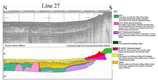 The northern Ischia debris avalanche deposit is crossed by seismic profile L27. The deposit is organized into two distinct superimposed bodies (H1 and H2; Figure 14). The basin filling is composed of three seismo-stratigraphic units (C, D, E), partly in facies hetheropy with the upper part of buried volcanic structures, acoustically transparent, and characterized by a dome-shaped external geometry (Figure 14).
