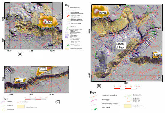 Detailed geomorphological maps of Naples Bay showing marine hazards (in yellow). (A) Ischia; (B) Naples canyons, (C) southern slope of the Sorrento Peninsula (modified after Aiello and Sacchi [].