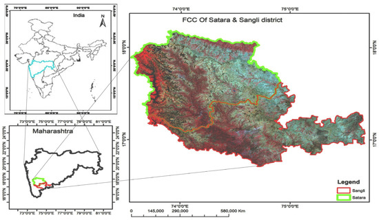 Study area—Satara and Sangli districts of Maharashtra as represented by false color composite (FCC) image (Source: Landsat-8). This represents India, the state Maharashtra and FCC of the study area.